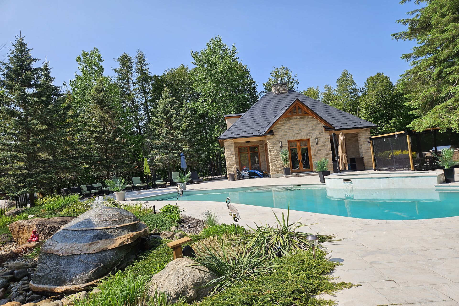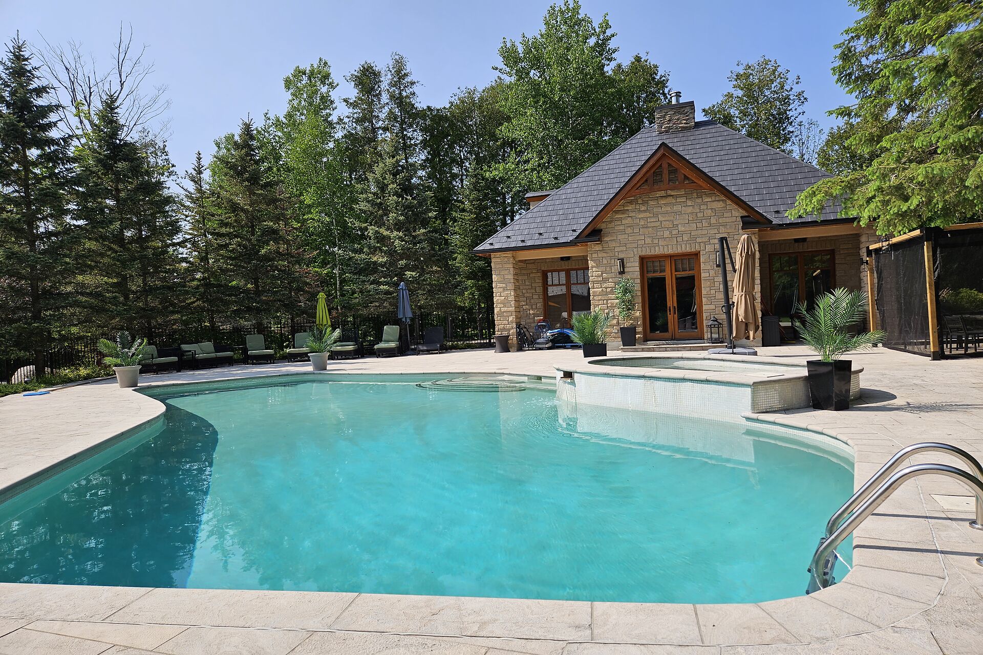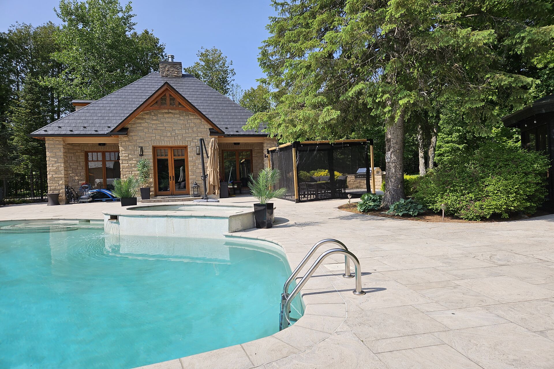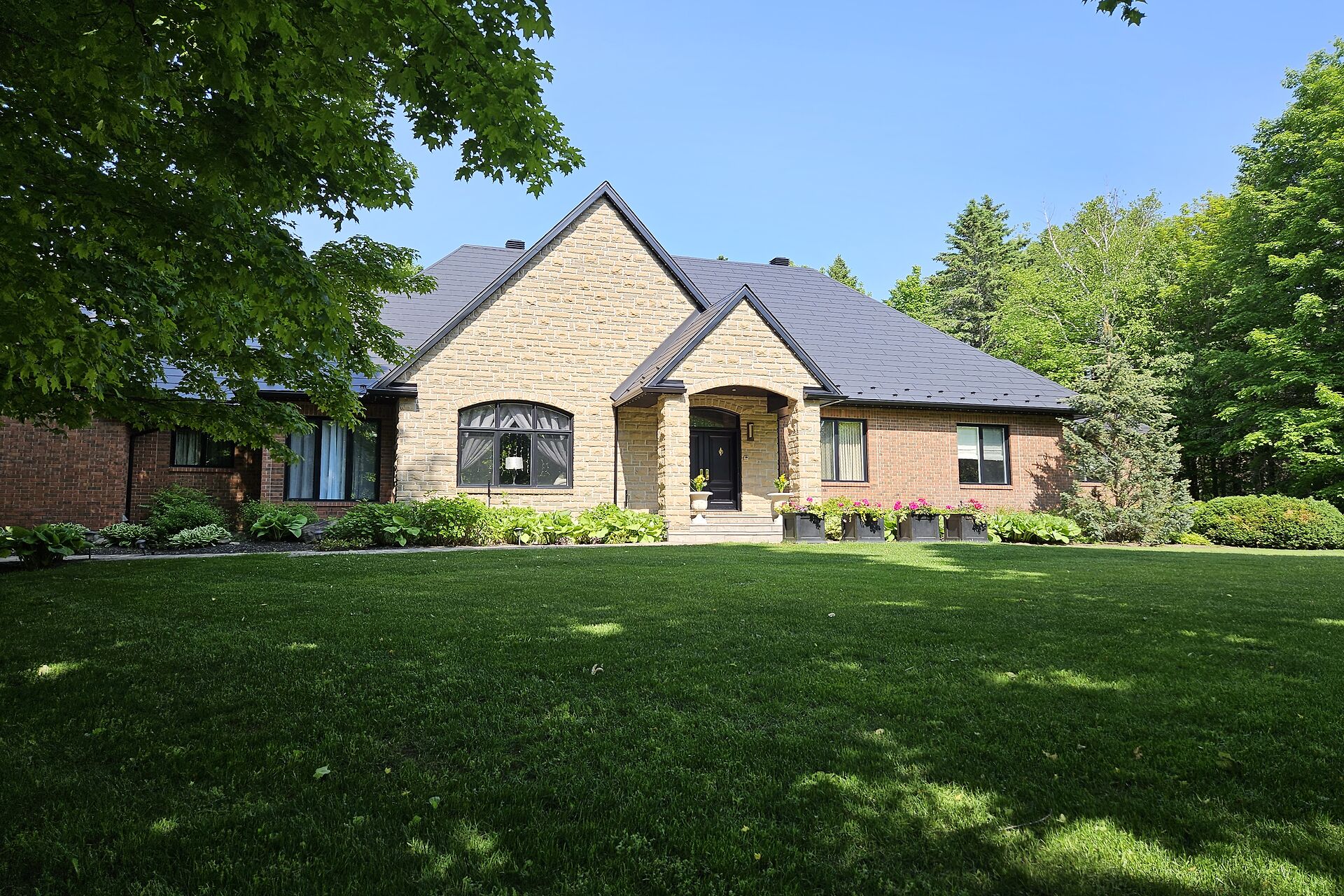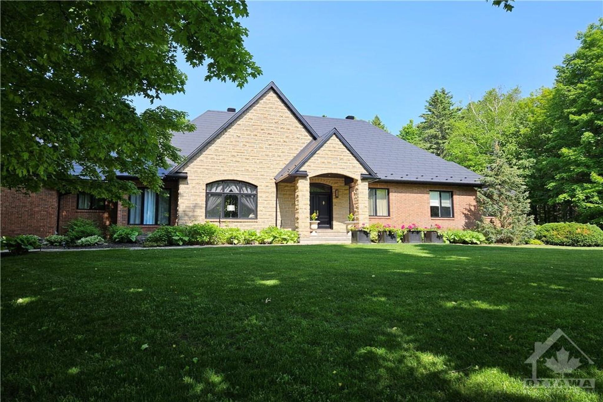 Discover the essence of opulent Bungalow living in Manotick. Nestled in luxurious Rideau Forest on a 2.07 acre, treed lot, this sought-after enclave is a modern masterpiece, where luxury meets tranquility. The allure begins with a harmonious blend of serene surroundings and urban accessibility. Step into your private oasis, a rear yard beyond imagination. Lush landscaping envelops a pristine pool & spa and a sophisticated guest house, creating an atmosphere of pure relaxation for entertaining. The architectural marvel of peaked metal rooflines embody quality & sophistication. Meticulous design details, expansive windows, 10 ft. ceilings create spaces flooded with light. 5 Bdrms 7 Baths, 3 gas fireplaces. 6094 sq. ft